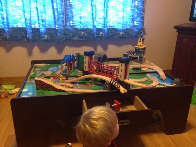 For Christmas, MJ got an amazing train table from his grandparents. Yesterday, CJ spent hours putting it together and the boys loved playing with it. This morning, the first thing MJ ran to was his playroom so he could play with his trains some more. Then he pulled a “Godzilla” and decided to really have some fun.